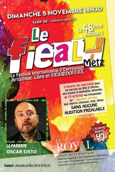 Avis aux Artistes de tout l’univers qui veulent passer sur la scène du Royal lors de la 48e édition du FIEALD de Metz avec un parrain de renom, Oscar Sisto: inscrivez-vous à 17H pétantes pour tenter votre chance et faire partie des 10 sélectionnés qui présenteront leurs performances, leurs shows, leurs sketchs et leurs actus.