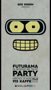 Bwef ! Le Futurama est à l’honneur ce MERCREDI 23, entre 22h et 4h, avec une entrée à 3Euros. Viendez nombreux ! Ne manquez pas cet événement ou Bender viendra s’occuper de votre belle petite paire de fesses ;)