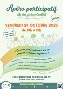 Notre apéro participatif de la parentalité est une invitation à se retrouver dans un cadre chaleureux et bienveillant pour échanger autour de nos expériences, nos questionnements et nos défis de parents. Ce moment convivial aura lieu le vendredi 24 octobre 2025, de 10h à 12h, à l’école du Conseil des XV. Nous aborderons notamment la question : « Comment vivre et avancer ensemble sereinement en famille ? »