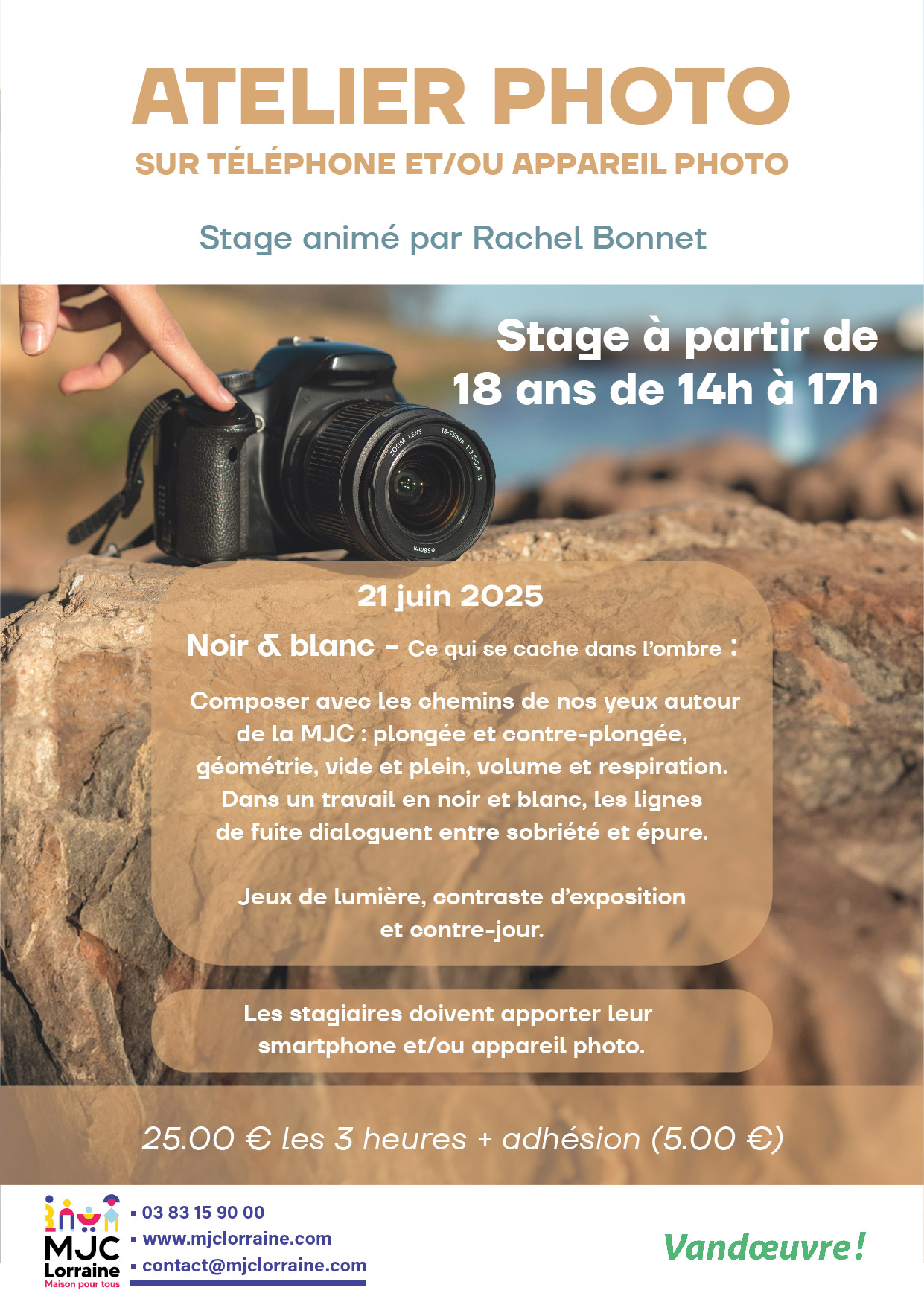 Rachel Bonnet vous propose une série d’ateliers pour explorer différentes approches de la photographie et affiner votre regard. À travers des exercices pratiques et des conseils techniques, chaque séance abordera un thème spécifique pour vous aider à capturer des images percutantes et expressives.