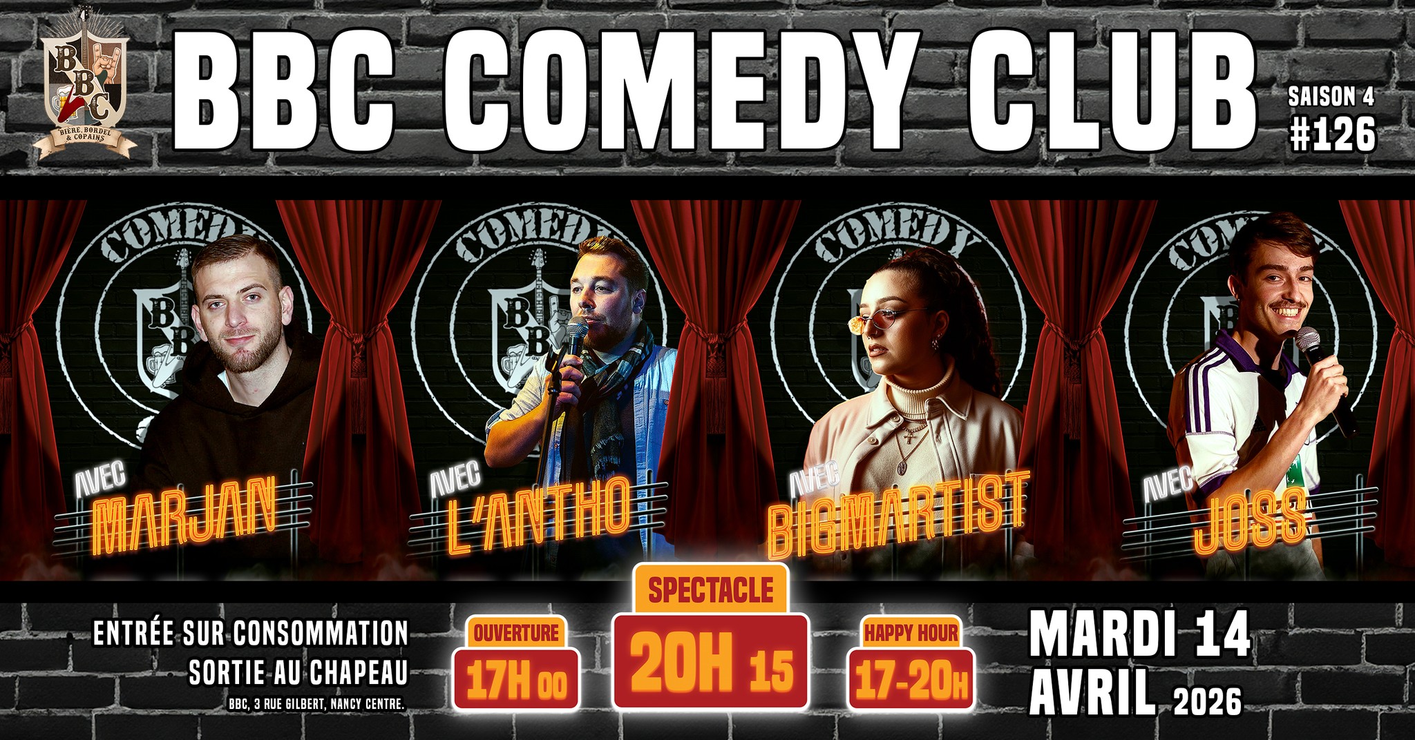 🎤🤣 Édition #126 du BBC Comedy Club (saison 4) – Mardi 14 avril 2026 à 20h15 !