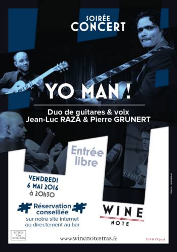 Le duo guitares + voix "Yo Man !" revient, et vous invite à une parenthèse musicale, sur un air de jazz, de rythme&blues, de soul et de bossa nova. Toujours portées par le groove, leurs improvisations sauront vous emporter. Jean-Luc Raza et Pierre Grunert sont complices depuis 20 ans et leur plaisir de jouer avec les mélodies et le verbe est inaltérable… pour encore longtemps !