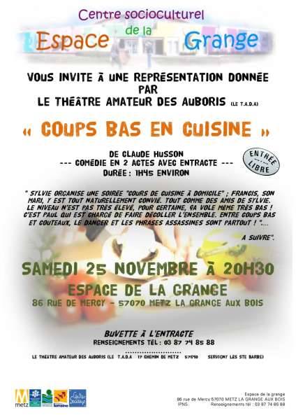 Rendez-vous à l’Espace de la Grange pour une représentation de la pièce « COUPS BAS EN CUISINE », offerte par le Théâtre Amateur Des Auboris (Le T.A.D.A. / SERVIGNY LES SAINTE BARBE).