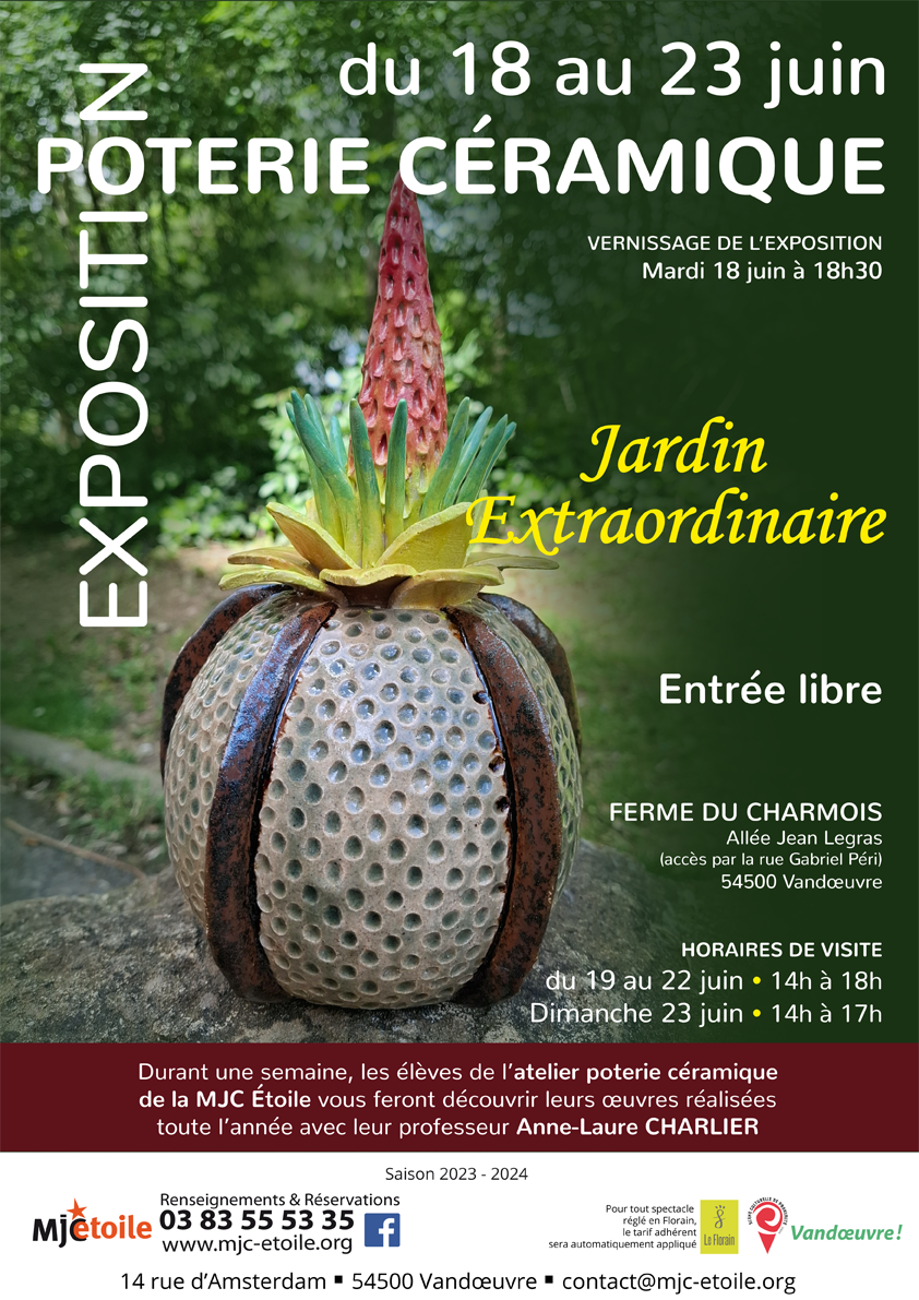 Durant une semaine, les élèves de l’atelier poterie céramique de la MJC Étoile vous feront découvrir leurs œuvres réalisées toute l’année avec leur professeur Pascale Saint Martin. Le thème de cette année est Jardin Extraordinaire