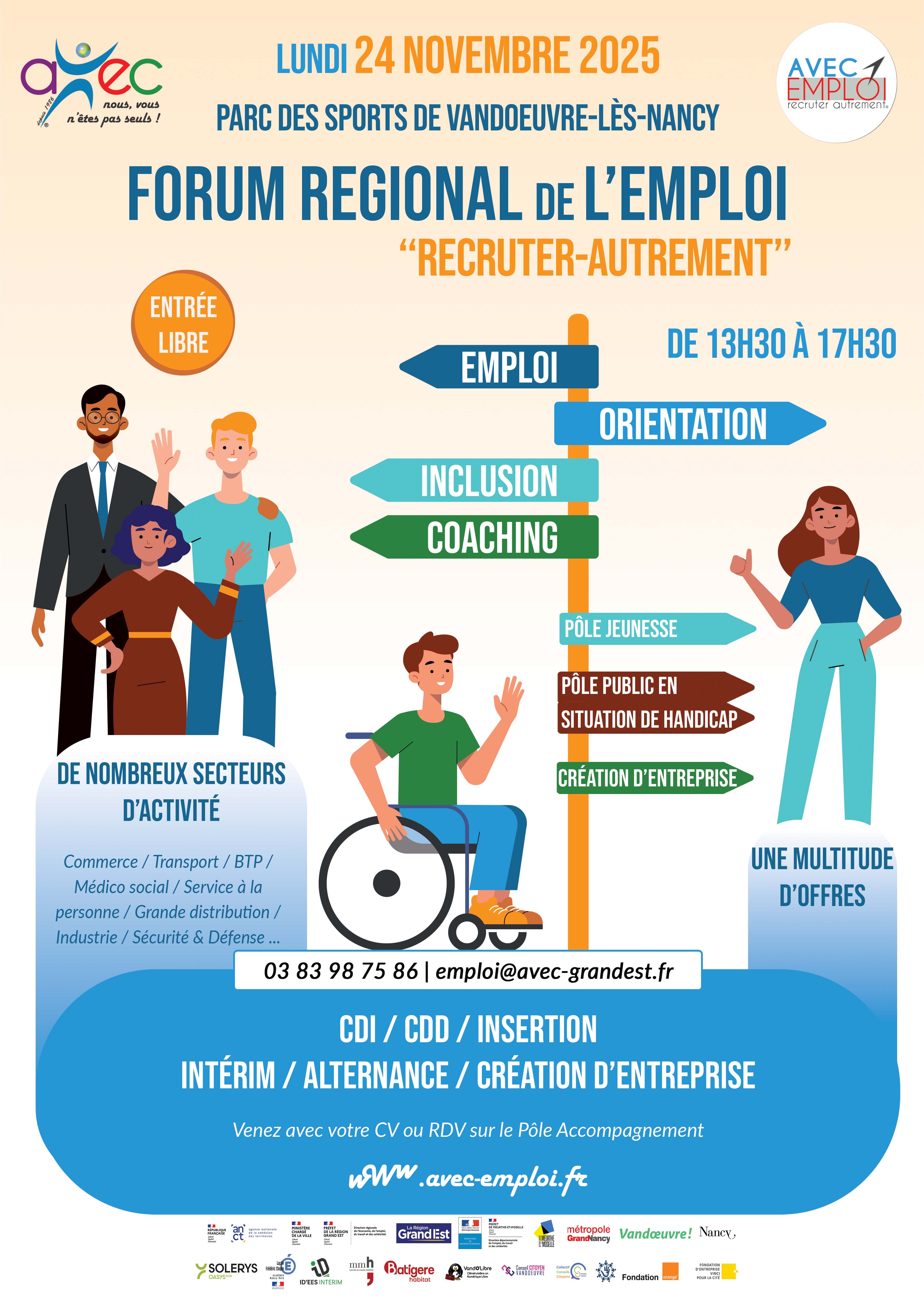 L'Association d'Éducation Populaire pour l'Égalité des Chances AVEC organise, en collaboration avec ses partenaires, la 27ème édition du Forum Régional de l'Emploi ''AVEC'Emploi, recruter-autrement'' qui se tiendra le lundi 24 novembre 2025 de 13h30 à 17h30 au Parc des Sports de Vandœuvre-lès-Nancy