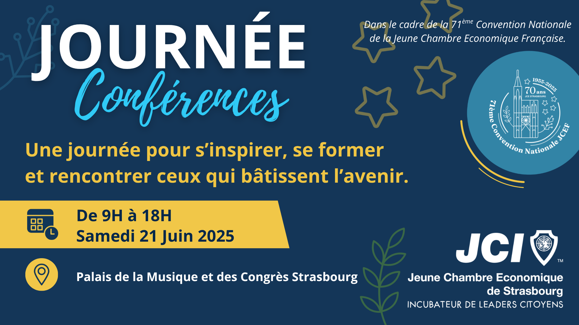 Dans le cadre de la Convention Nationale 2025 qui a pour thème "Héritage et Innovation", la Jeune Chambre Economique de Strasbourg propose un cycle de conférences sur l’innovation en Alsace (IA, médecine, autonomie alimentaire, industries créatives) et de la coopération transfrontalière pour une Europe durable. Des personnalités inspirantes partageront également leurs engagements pour l'écologie, la culture et le leadership.