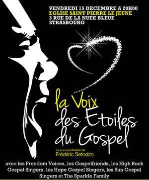 Le 15 décembre 2017 à l’Eglise Saint-Pierre le Jeune (3 rue de la Nuée Bleue à Strasbourg) aura lieu la quatorzième édition de la Voix des Etoiles du Gospel. Toujours le même concept : ce concert exceptionnel réunit les groupes initiés par Frédéric Setodzo: Les Freedom Voices, les Gospelfriends, les High Rock Gospel Singers, les Hope Gospel Singers, les Sun Gospel Singers et The Sparkle Family pour un grand moment de partage et de fraternité.