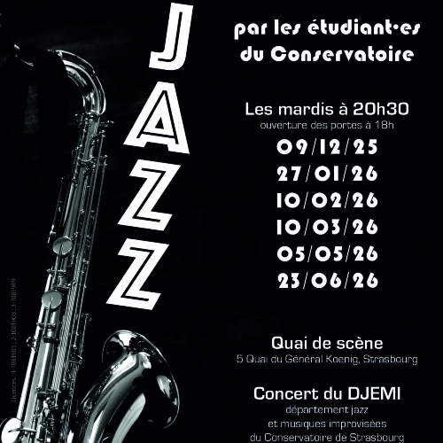 Dans le cadre du Nid du Jazz, le Quai de scène accueille les étudiant·e·s du Conservatoire de Strasbourg pour des soirées exceptionnelles. Venez découvrir les talents d’aujourd’hui et de demain lors de ces concerts organisés par le département jazz et musiques improvisées.