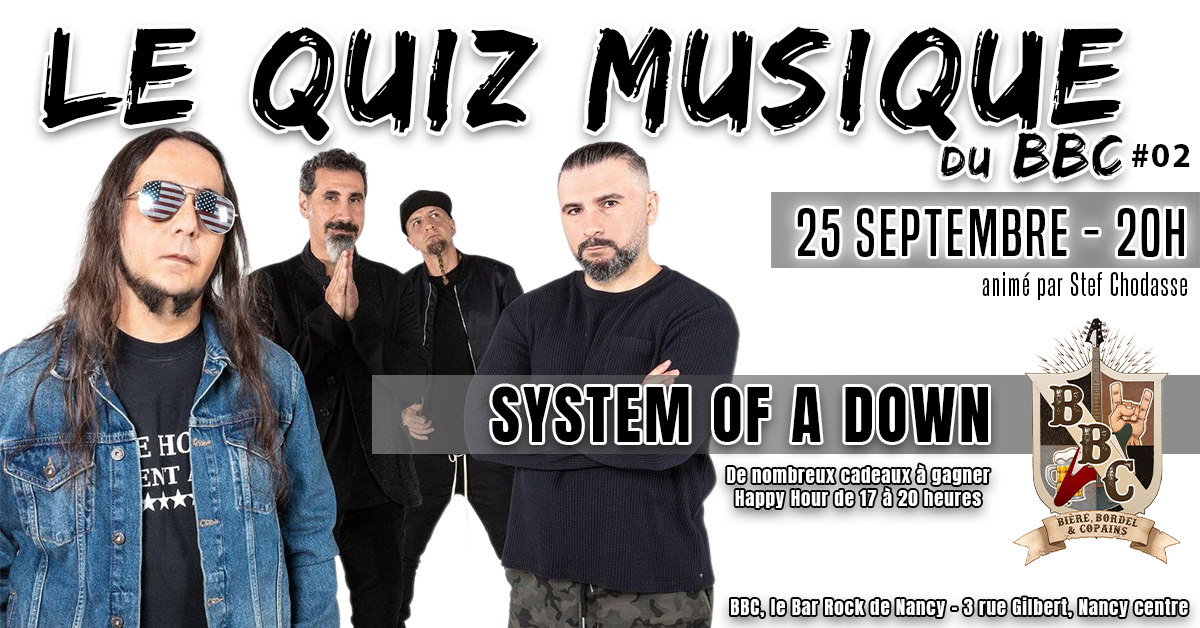 ⚡ Jeudi 25 septembre à 20h, le BBC te fait plonger dans l’univers déjanté des créateurs de "Chop Suey!", "B.Y.O.B" et "Toxicity". Au moins 15 questions pour tester tes connaissances sur leur carrière explosive, entre riffs furieux et refrains inoubliables.