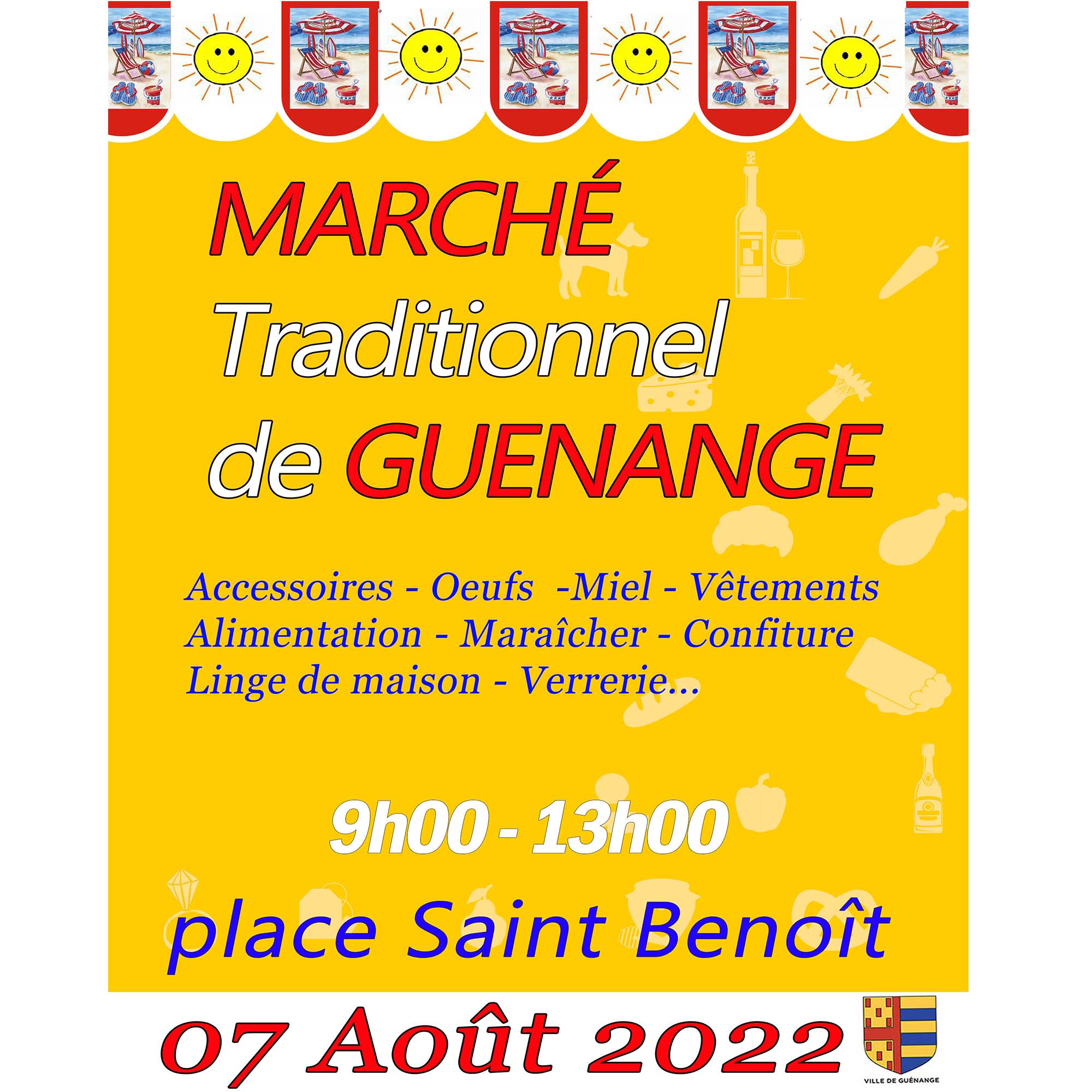La Ville de Guénange organise son marché traditionnel le 7 août 2022, de 9h à 13h sur la place Saint Benoît.