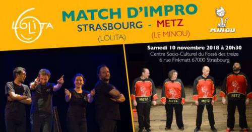 De Metz à Stras : du haut de ces deux ligues de théâtre d’improvisation, 40 ans nous contemplent! Hé oui Le Minou de Metz a 15 ans cette année et a répondu à l’invitation des voisins Strasbourgeois de la Lolita pour un match d’impro en forme de derby du Grand Est! La rivalité a toujours était vive entre Alsaciens et Lorrains même si bon enfant, un peu comme si on s’envoyait des mirabelles au visage mais qu’on finissait toujours par la boire ensemble à la fin. Ce match Strasbourg - Metz sera l’occasion de raviver nos passions et d’en rire ensemble autour de celle qui nous réunit par dessus tout : le théâtre d’improvisation!