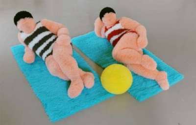 Cette performance est une déclinaison vivante et amusée, pendant laquelle un couple de grosses poupées en maillots à rayures, entièrement en tulle plissé, rejoue des scènes de bord de mer. Bain de soleil, farniente, jeux, et autres postures typiques des baigneurs : elles s’activent lentement autour de deux grandes serviettes bleues et d’un ballon jaune en tulle. Loin des bords de mer, ces personnages tout en rondeurs réveillent l’imaginaire des flâneurs et des spectateurs de passage.