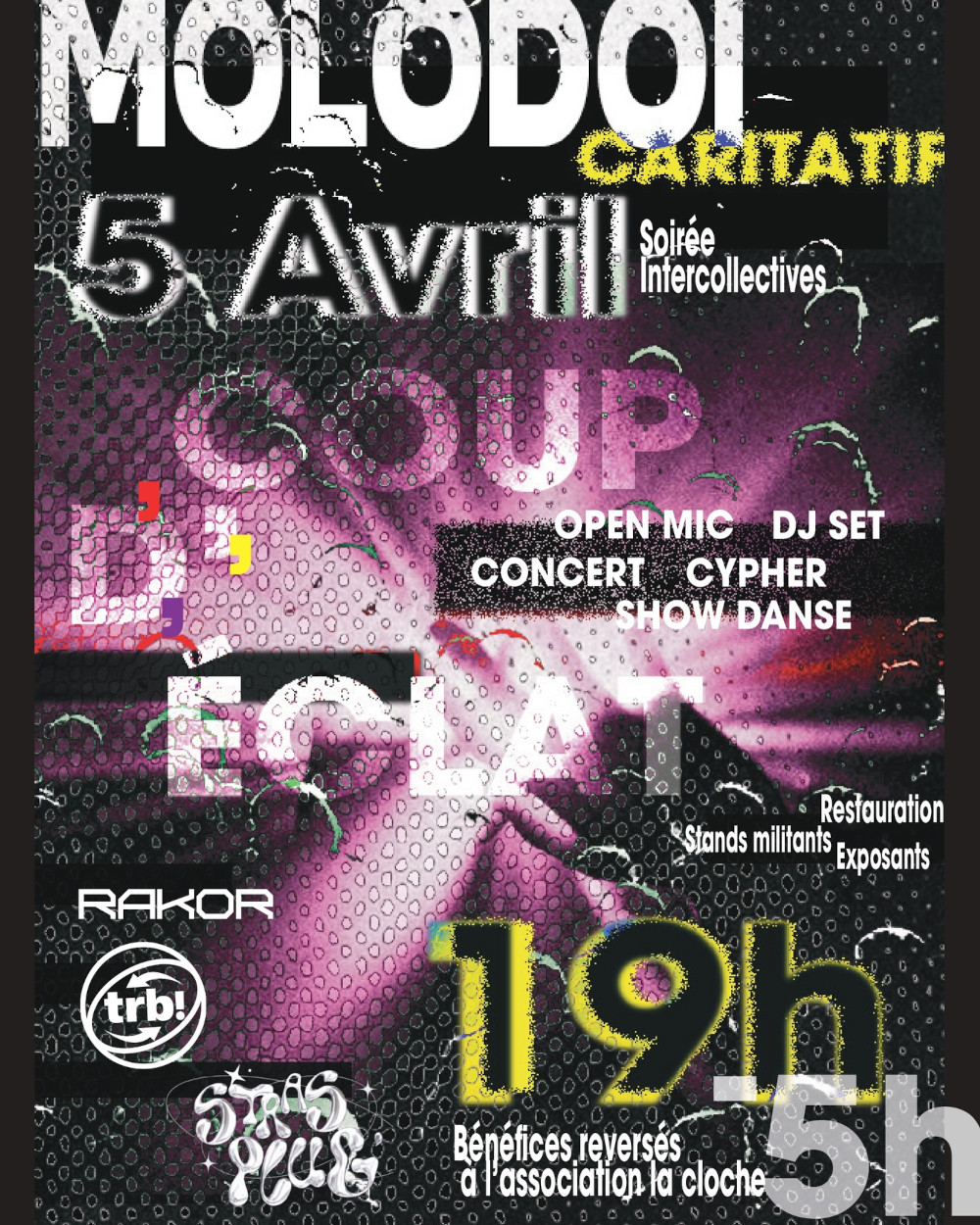 Turbulences, Rakor et Strasplug ont l’honneur de vous convier au Coup d’Éclat, soirée intercollectif et caritative au profit de l’association La Cloche le 5 avril au Molodoï ‼️