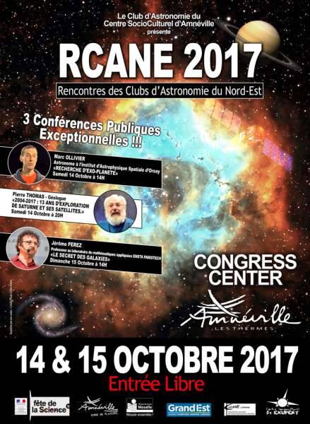 Le club d’astronomie d’Amneville-lès-Thermes a l’honneur de vous convier le weekend du 14 et 15 Octobre 2017 à l’espace Jean Kiffer au centre Thermal, à la rencontre des clubs astronomie du Nord Est de la France (RCANE) et également pour fêter les 30 ans de notre club.
