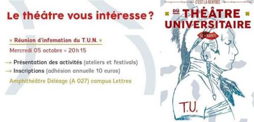 On vous attend le 5 octobre à 20h15, à l’Amphithéâtre Déléage A027 au Campus Lettres de Nancy pour découvrir les différents ateliers proposés par le Théâtre Universitaire de Nancy !