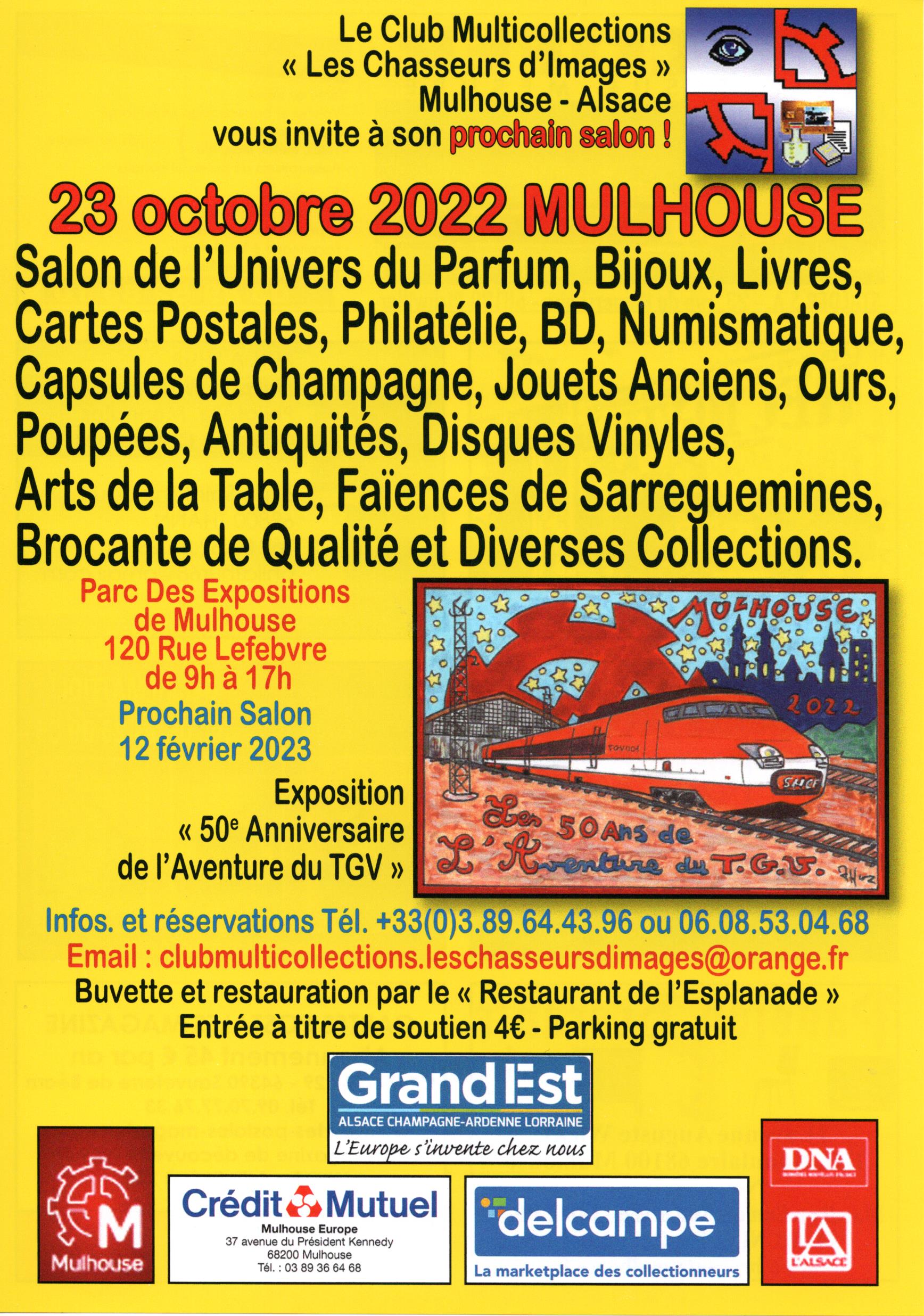Salon agrémenté avec de la Brocante de Qualité, Arts de la Table, Faïences de Sarreguemines, Objets de Décoration, Antiquités et Diverses Collections de l'Univers du Parfum, de Miniatures et Flacons de Parfum Anciens, Cartes Parfumées, Objets Publicitaires en Parfum, Bijoux, Cartes Postales, Philatélie, Monnaies, Télécartes, Affiches, Vieux Papiers de Collections, Lithographie, Capsules de Champagnes, Disques Vinyles, Ours et Poupées, Insignes et Décorations Militaires, Jouets et Jeux Ancien, Objets Brassicoles, Plaques Emaillées, Livres Anciens et Alsatiques, BD, Stylos Publicitaires, Fèves, Pin's ...