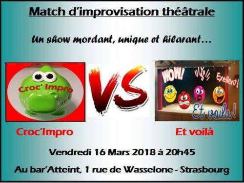 Le vendredi 16 mars à 20h45, Le Bar’Atteint sera le théâtre d’un match improvisé entre la troupe de Croc’Impro et leurs copains de Et voilà.