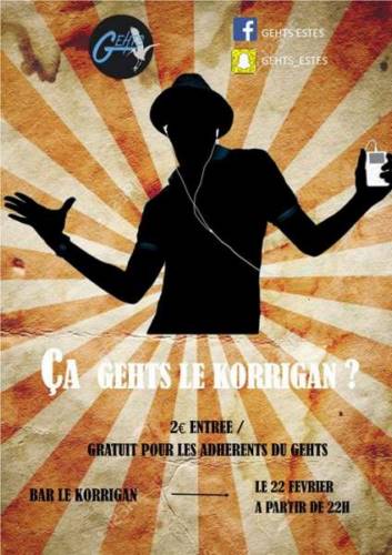 Première soirée du GEHTS, et c’est un moment de fête, de convivialité et de rencontre. Cet événement se passera dans un bar de Strasbourg, au nom champêtre de KORRIGAN. Pour un événement tel que celui-ci, tout le monde est convié à passer une soirée dans ce lieu, et ce pour la modique somme de 2 Euros.