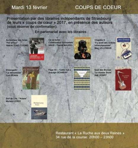 Présentation par des libraires indépendants de Strasbourg de leurs coups de coeur 2017, en présence des auteurs ( sous réserve de confirmation )