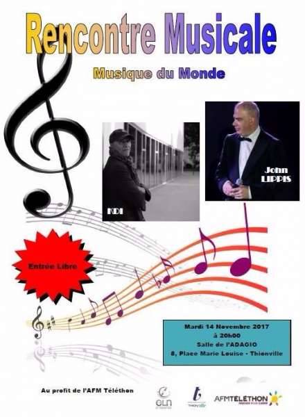 Au profit de l’AFM téléthon, une soirée musique du monde par KDI et John LIPPIS sera organisée le mardi 14 novembre 2017 à 20h à l’Adagio.