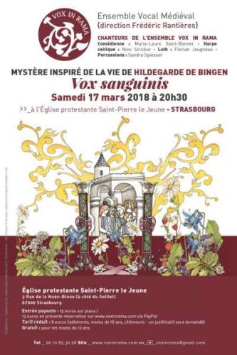 L’ensemble médiéval Vox In Rama propose au public de (re)découvrir la célèbre abbesse du XIIe siècle Hildegarde de Bingen au travers de ses Visions, écrits, Symphonies et réflexions thérapeutiques, dans un drame musical original, à la fois contemporain et médiéval.