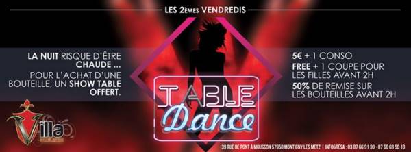 Tous les 2ème Vendredis du mois, la Villa Rouge vous offre un Table Dance pour l’acahat d’une bouteille.
