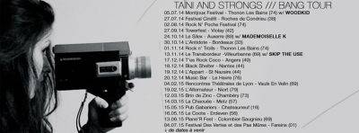 En février 2014, les lyonnais nous livrent un premier album détonnant, mélange d’esthétiques et d’influences variées au service d’une pop sauvage et débridée dont ils ont le secret. Bande originale d’un film imaginaire, Bang ! s’inscrit dans la longue lignée des BO « Tarantiniennes » qui donnent envie de taper de la santiag en mâchant du bubble gum. Rock à paillette ou Power Pop, Taïni and Strongs ne choisit pas. Le groupe jongle avec les codes avec une habileté déconcertante et une efficacité rageuse qui vous propulsent tour à tour dans Reservoir Dog, Pulp fiction ou Jackie Brown. A l’instar de sa pochette, qui superpose le street art acidulé résolument pop de l’artiste Jaké à une photo rugueuse du groupe, Bang ! mélange les genres, tape aux yeux et aux oreilles, et ça va faire du bruit.