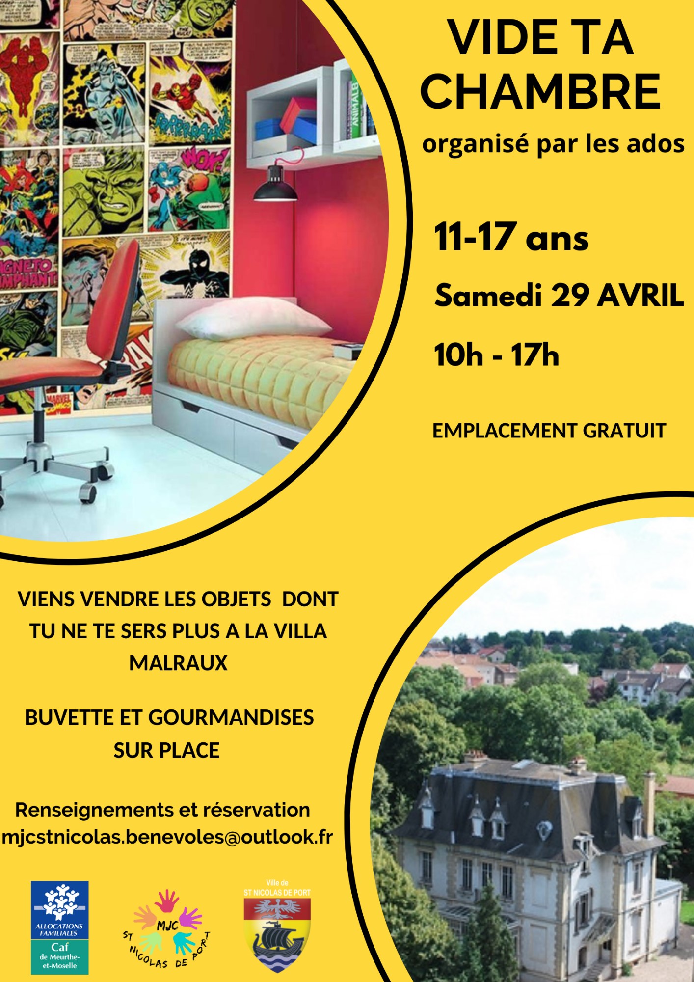 Le Vide Ta Chambre est la première brocante de Saint Nicolas de Port réservée au 11-17 ans, qu’ils soient exposants ou visiteurs. Elle se tiendra le samedi 29 avril 2023, dans le parc de la MJC.