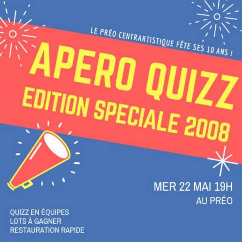 Entre amis, en famille, entre collègues ... En équipe, venez tester votre culture G. sur les tubes, l’actualité, les événements de l’année 2008 ! Cet "ApérO Quizz" est organisé dans le cadre des "10 ans du PréO Centrartistique" à Oberhausbergen.