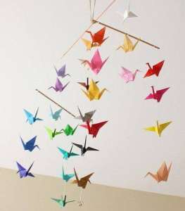 Réalisation de mobiles ou guirlandes avec grues et oiseaux de papier.