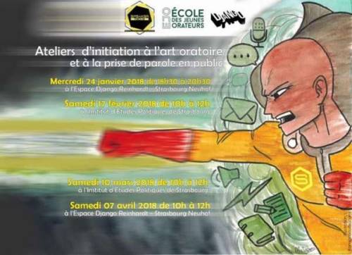 Ce 1er atelier est proposé par Sp3ak3r en partenariat avec EJO - École des Jeunes Orateurs de Sciences Po Strasbourg,l’Espace Django - Strasbourg, avec la participation de Planète Neuhof. Animé par deux étudiants de Sciences Po Strasbourg (Maxime Cléret et Geoffrey Gdj), venez vous initier à l’art oratoire et à la prise de parole en public. Places limitées sur inscription à l’adresse speakerstrasbour@gmail.com ou par MP. Réservé en priorité aux habitants du Neuhof et acteurs associatifs oeuvrant dans le secteur Neuhof-Meinau.