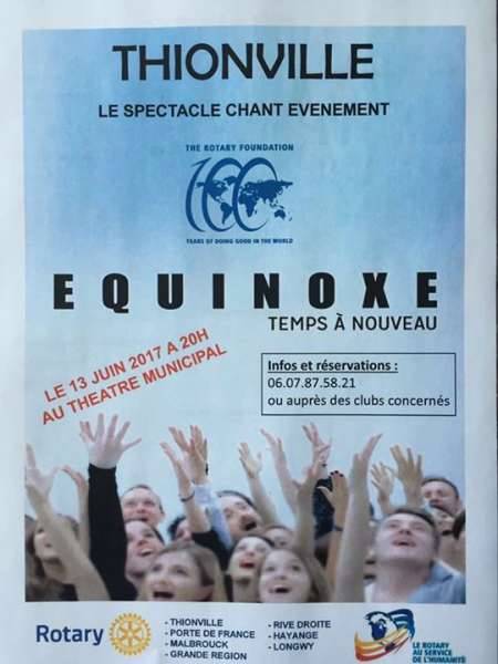 Pour fêter le centenaire de la Fondation du Rotary, l’ensemble des clubs thionvillois vous invite au concert de la chorale Equinoxe le 13 juin à 20h au Théatre de Thionville, entrée 20 Euros.