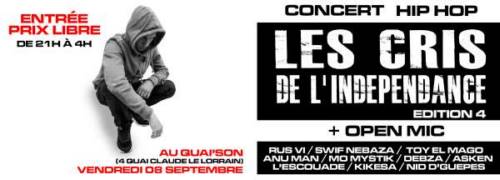 Après un peu plus d’1 an d’absence, l’événement Hip-Hop "Les Cris De L’Indépendance" revient avec sa 4ème édition et cette fois au Quai’Son !