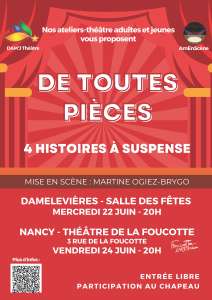 AmEnScène, vous donne rendez-vous et a le plaisir et de vous présenter son spectacle initutlé De toutes pièces composé de 2 petites pièces et 2 saynètes d'une durée globale d'environ 1h45.