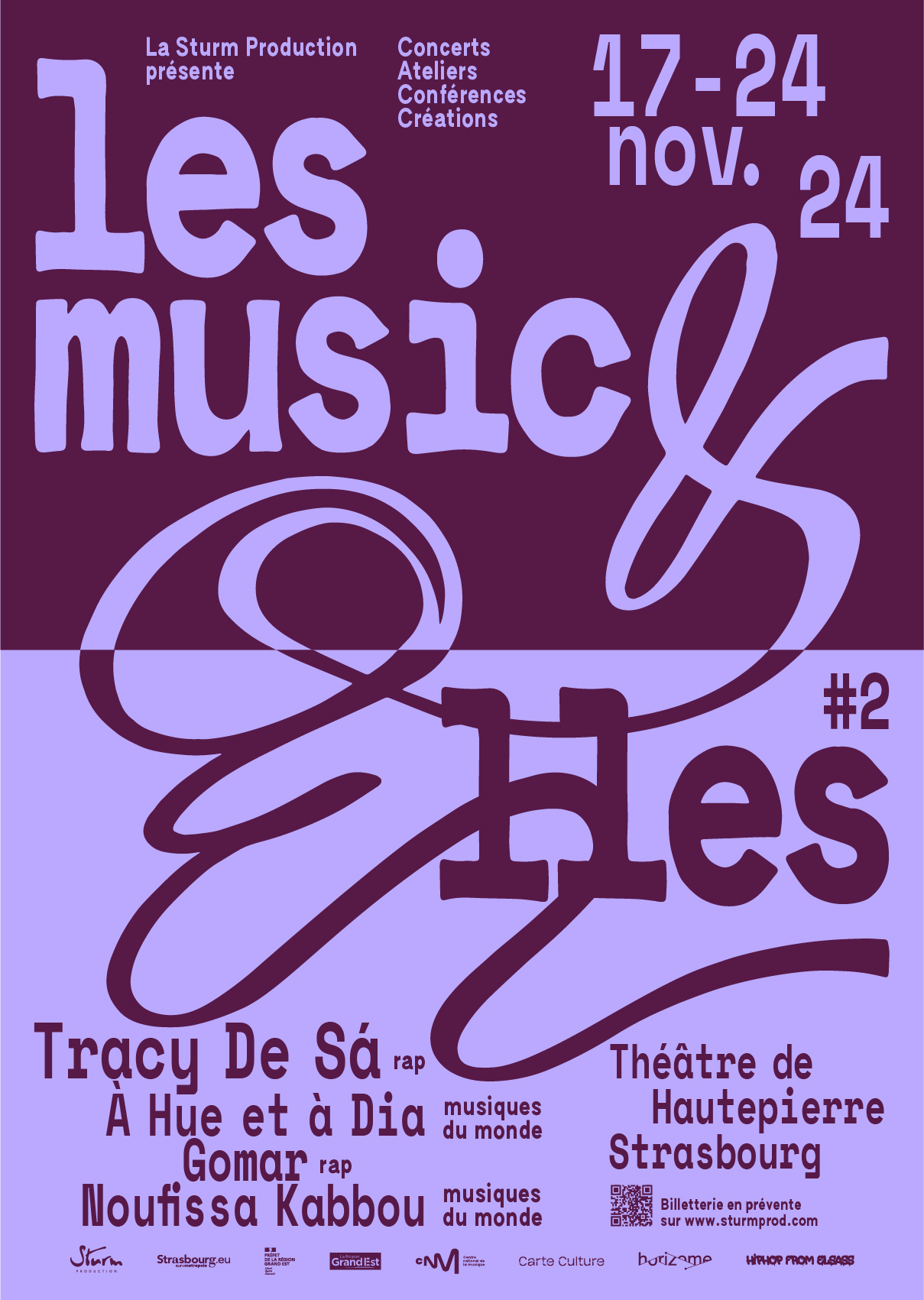 Avec cette 2ème édition du festival Les Music&lles, nous proposons pendant une semaine, du 17 au 24 novembre, au Théâtre de Hautepierre et au studio La Ruche à Strasbourg, des ateliers de création musicale, de beatmaking et d'enregistrement en non mixité pour prendre confiance et oser se lancer, des ateliers d'éveil musical en famille, des rencontres et conférences dans une approche intersectionnelle, des concerts de rap et de musiques du monde avec des artistes talentueuses qu'on ne voit pas souvent...Laissez vous surprendre et venez !