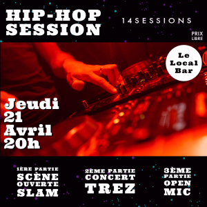 14Sessions et Le Local vous invitent à les rejoindre pour une soirée 100% Hip hop ! Au menu, des lyrics travaillées, des rimes qui claquent, des instrus qui font bouger les têtes!