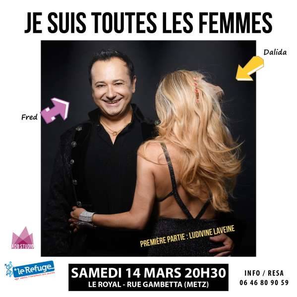 Samedi 14 mars à 20h30 au ROYAL, 2 rue Gambetta à Metz, vous découvrirez FRED FAURE dans la pièce musicale autobiographique JE SUIS TOUTES LES FEMMES. Le comédien et chanteur y rend un hommage poignant à son idole DALIDA . Il y retrace son parcours d’homme avec émotion et parfois humour, et interprète une vingtaine d’extraits des plus grands tubes de sa vedette préférée, ainsi que des inédits pour appuyer et rythmer son témoignage. En première partie vous retrouverez la comédienne LUDIVINE LAVEINE que l’on a apprécié en tant que co-présentatrice de l’émission ÇA CARTOON sur canal+. LUDIVINE nous devoilera un extrait de son spectacle J’AI RENDEZ-VOUS AVEC VOUS! En interlude, NADO, la chanteuse espagnole présentera son premier single plein de soleil, DESPERTAR.