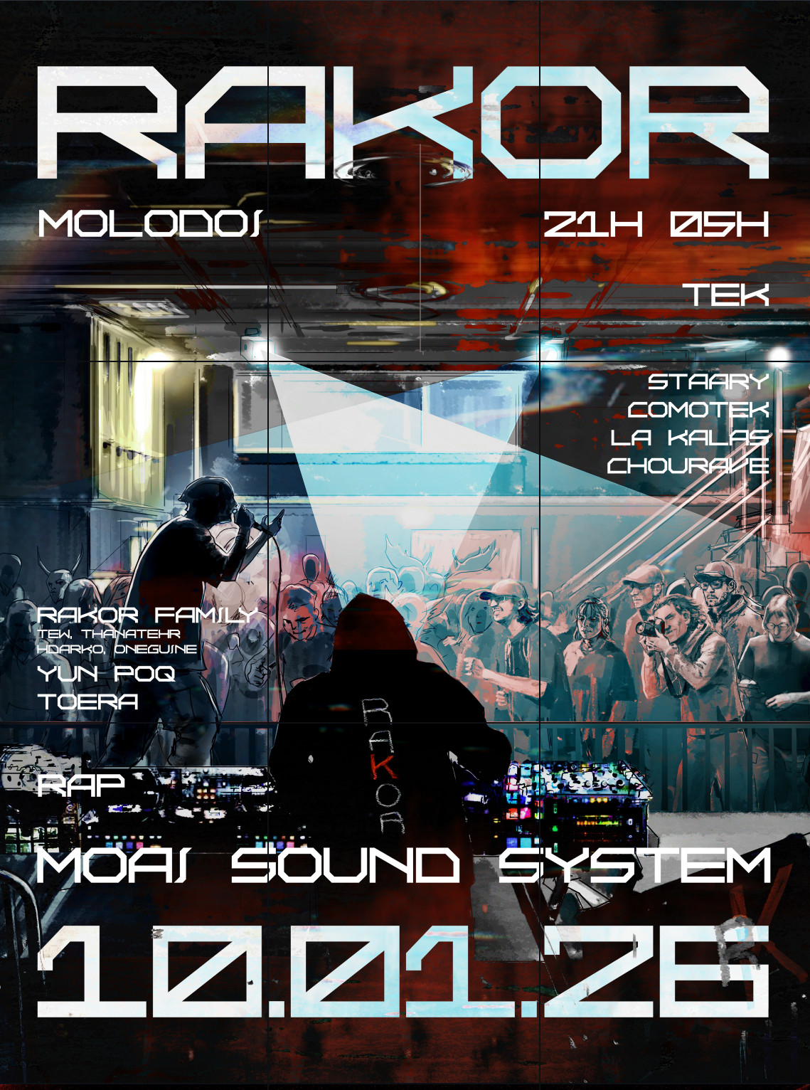 RAKOR, c’est avant tout une initiative collective où les univers du RAP et de la TEKNO se croisent, s'influencent et s'amplifient. Nous mettons en lumière des artistes locaux : MC’s, DJ’s, danseurs, graffeurs, tatoueurs... tous porteurs de la culture urbaine.