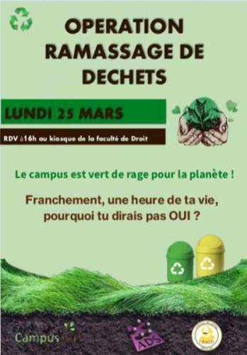 Dans le cadre de la Semaine de l’Environnement, les associations Campus Vert Strasbourg, l’Amicale des Sciences et l’Amicale des Lettres vous proposent de rejoindre leurs équipes pour effectuer un grand ramassage de déchets autour du campus central, du vieux campus et des berges de l’Ill ! Il vous suffit d’apporter votre motivation à rendre la ville plus propre et bonne humeur, sacs et gants seront distribués sur place !