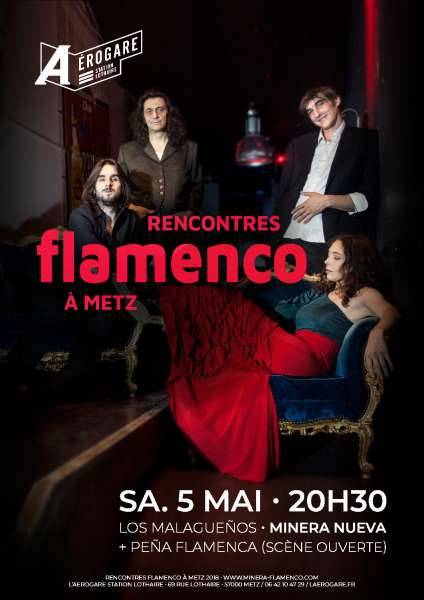 Le jeune groupe de flamenco lorrain se produit pour la première fois en quartet, à l’occasion de cette soirée spéciale flamenco à Metz. Avec Csaba Ökrös à la guitare et Assuntina Gessa à la danse, le petit duo formé en 2016 n’a pas chômé : après une année riche où il fait la première partie d’El Gato Negro à la foire Eco Bio d’Alsace, et de Gadjo Michto au estival Barakoz’art, Minera Nueva enrichit son set avec l’excellent percussionniste Christophe Tellitocci (Hugo F, Los Hermanos Locos…), et il propose pour la première fois son spectacle complet avec le contrebassiste de jazz Jacques Pegeot (Quartetum) et avec une création lumière originale de Eric Sauvage le samedi 5 mai 2018 à l’Aérogare à Metz. La soirée débutera avec en première partie le duo guitare / chant “Los Malagueños”, et s’achèvera sur une peña flamenco, sorte de scène ouverte festive typiquement andalouse pour musicien·ne·s et danseur·se·s.