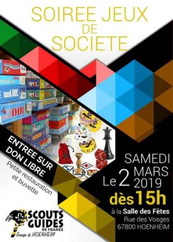 Les scouts et Guides de France de Hoenheim vous propose de venir jouer à des jeux de société le samedi 2 mars à partir de 15h, à la salle des fêtes de Hoenheim.