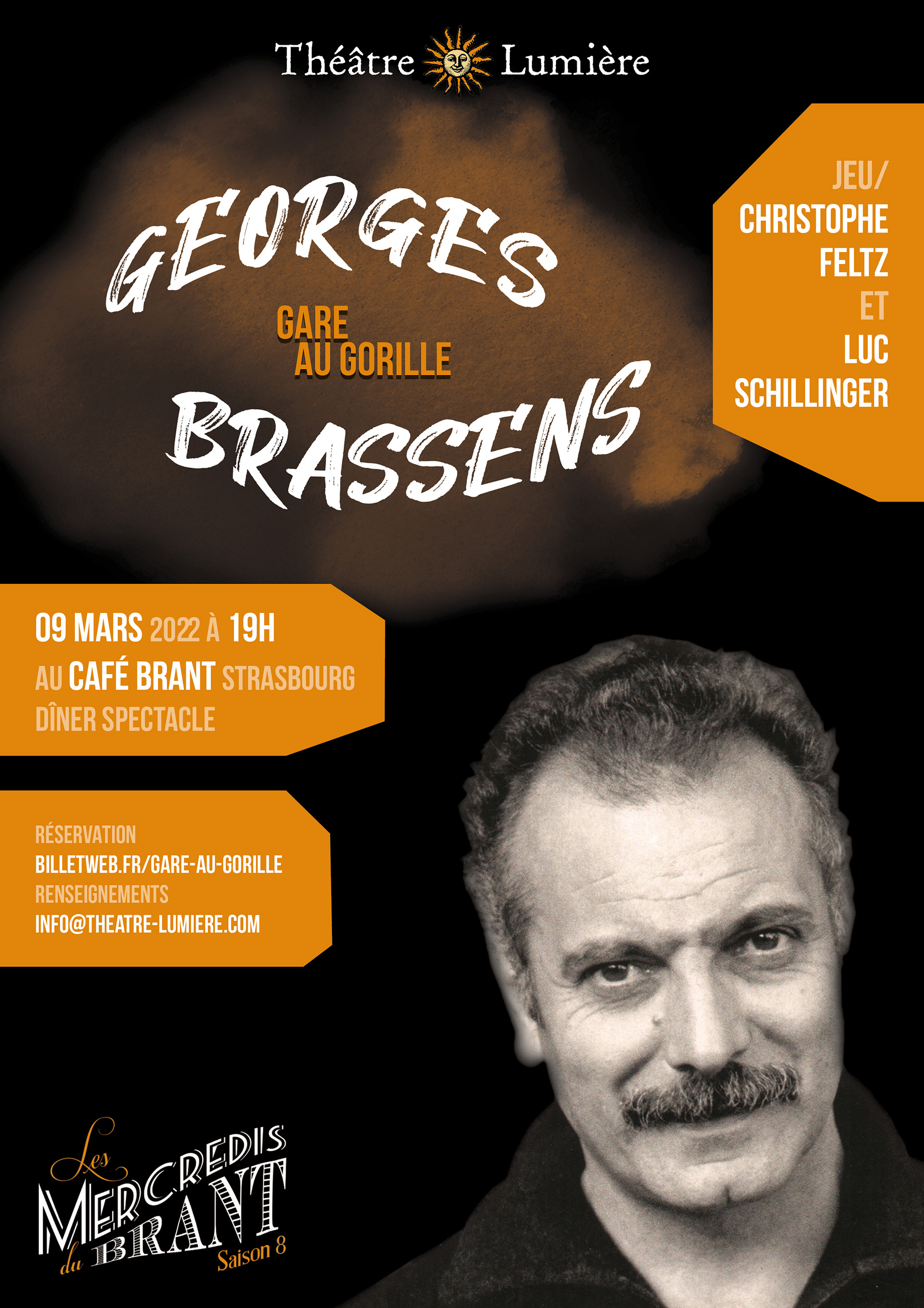 Pour cette nouvelle création, la compagnie Théâtre Lumière s’est immergée dans l’œuvre du grand auteur compositeur interprète Georges Brassens. « Gare au Gorille » offre une soirée en toute intimité avec l’essence même de l’artiste : son écriture ciselée et fine, sa poésie, sa tendresse, ses blessures, sa fragilité, son rapport aux femmes, son humanité et sa jubilatoire et profonde croyance en l’Amour.