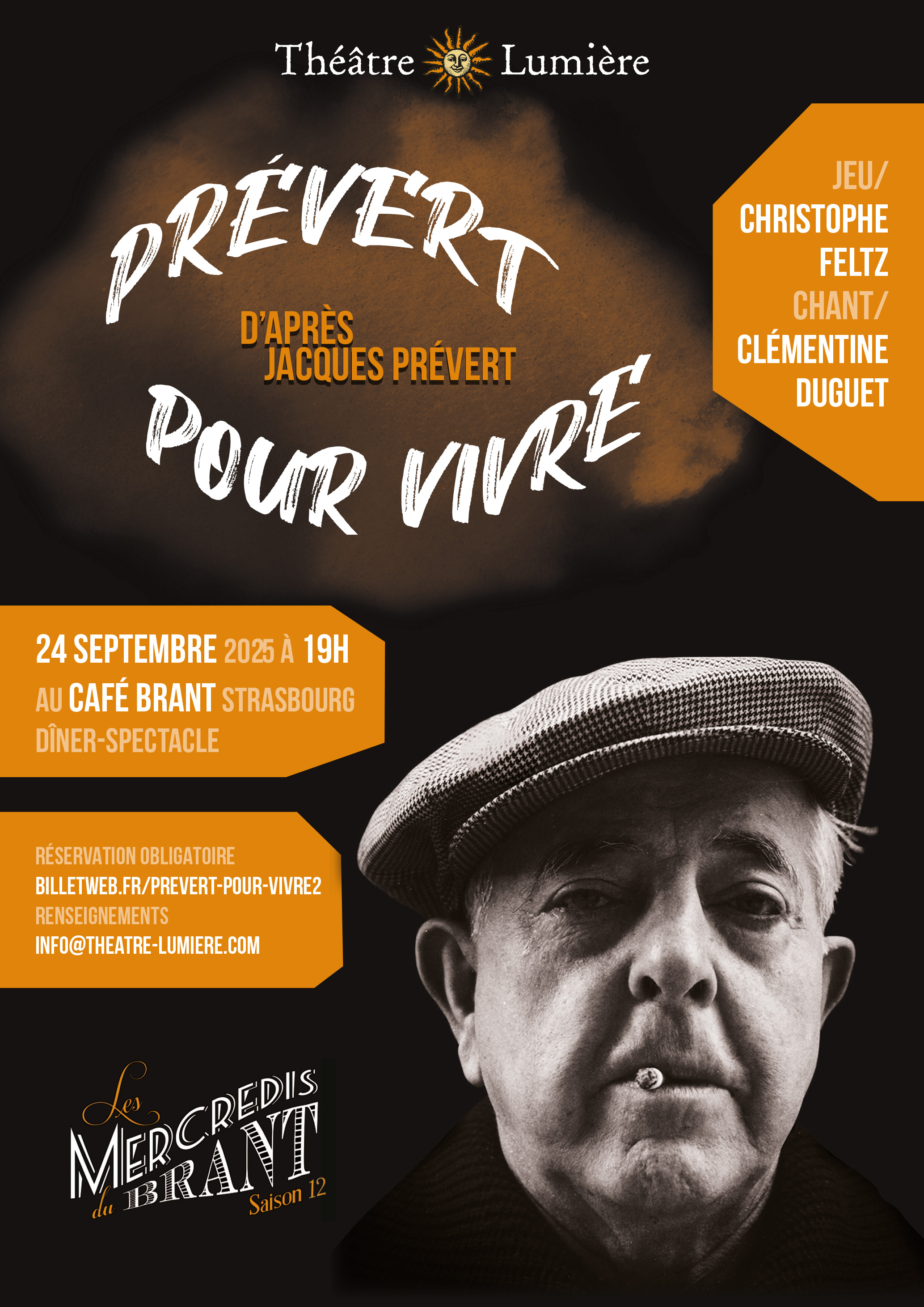 Dîner-spectacle, avec la création de théâtre musical « Prévert pour Vivre » d’après l’œuvre de Jacques Prévert,avec Christophe Feltz (jeu) et